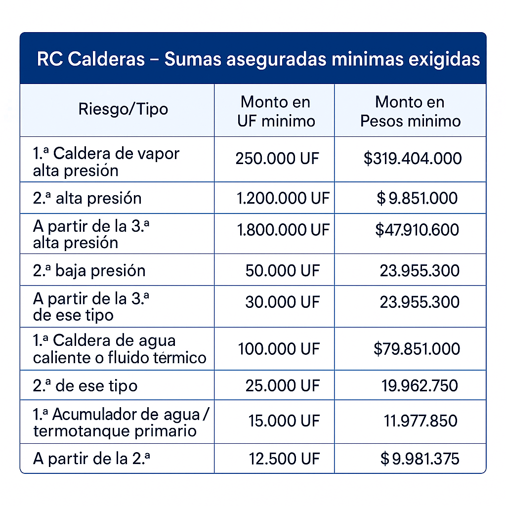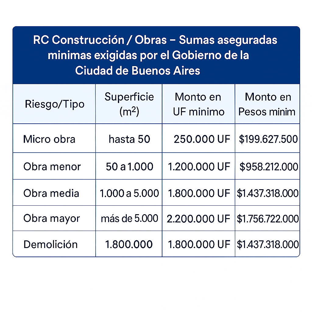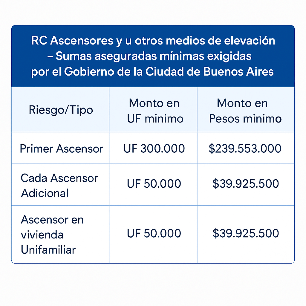 Acá te dejo una grilla actualizada de sumas aseguradas mínimas en pesos, para los seguros obligatorios de responsabilidad civil que exige el GCBA (RC Ascensores / RC Calderas / RC Conservadores de ascensores / RC Construcción etc.).